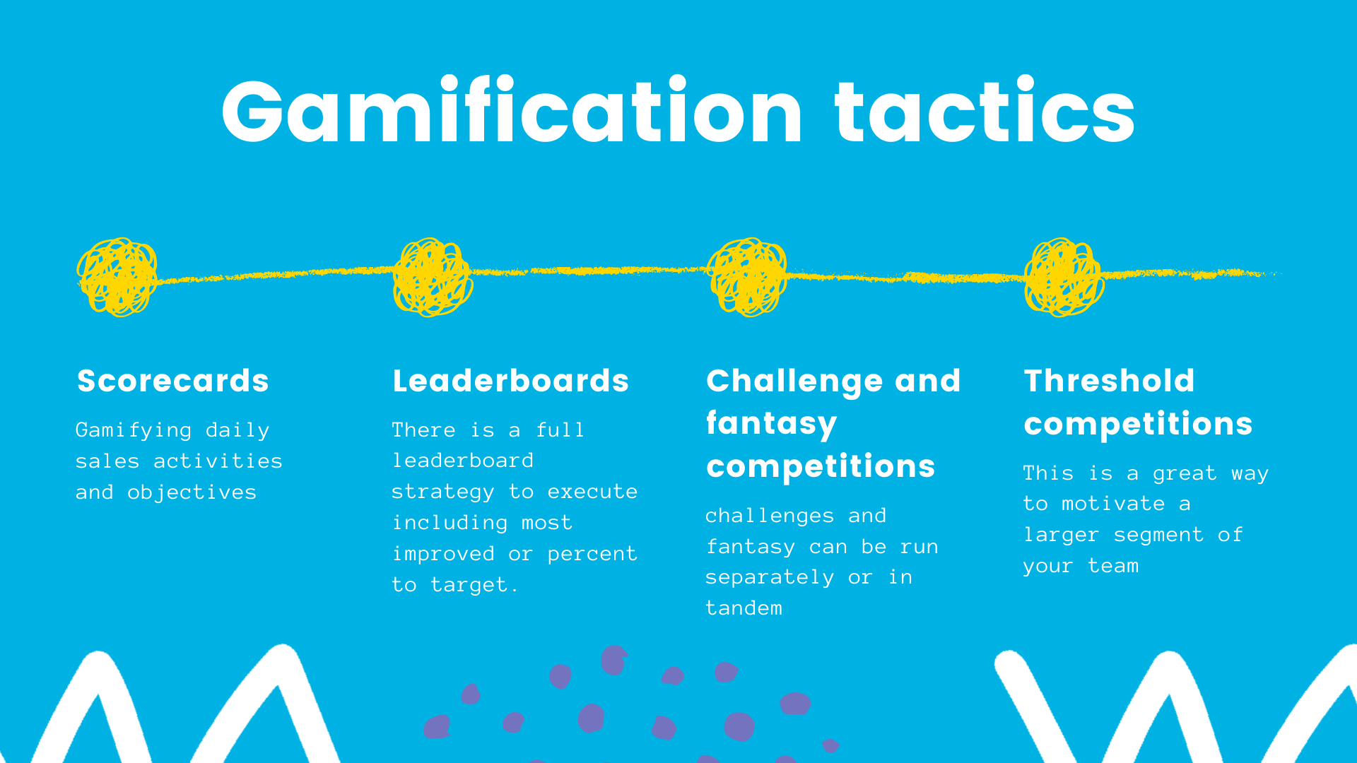 Sales managers have a number of gamification tactics that they can use to increase performance spikes on their team. Some of the tactics, like sales scorecards, are less about spikes and more about consistent behavior changes. Here is a look at why you might choose different gamification tactics in different scenarios: