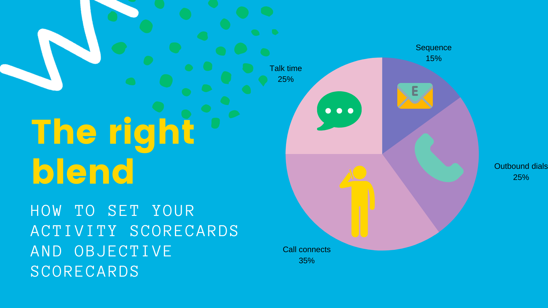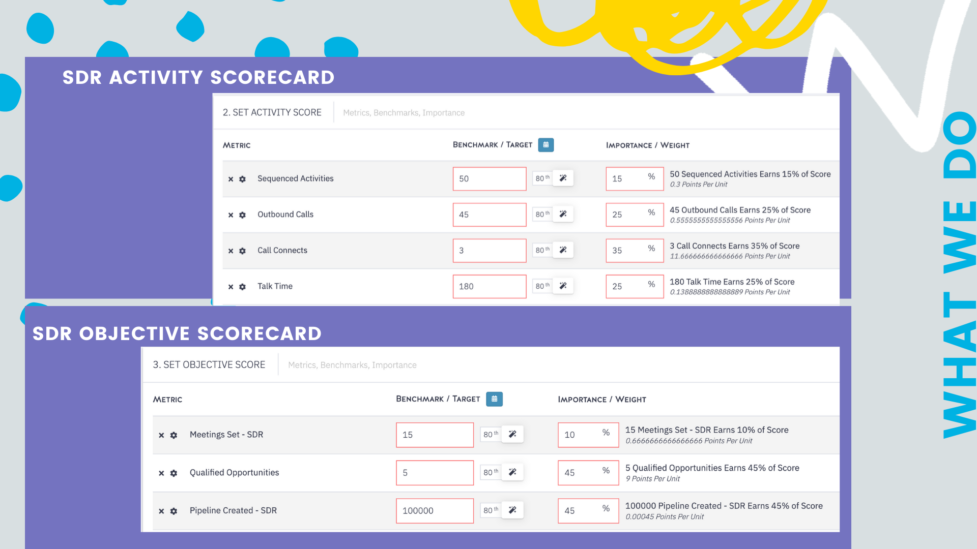 - Sales scorecards are great for ensuring you are tracking the right KPIs, driving the right behaviors and seeing consistent predictable performance. Break your scorecards down into activity metrics that are tracked daily or weekly and objective scorecards that are tracked weekly or monthly. This ensures your reps are focusing on dials, emails, LinkedIn connects, meeting sets, held meetings and all the early indicator behaviors that are required to produce outcomes. Your reps can end each day with a "perfect" score if they do all the right things!