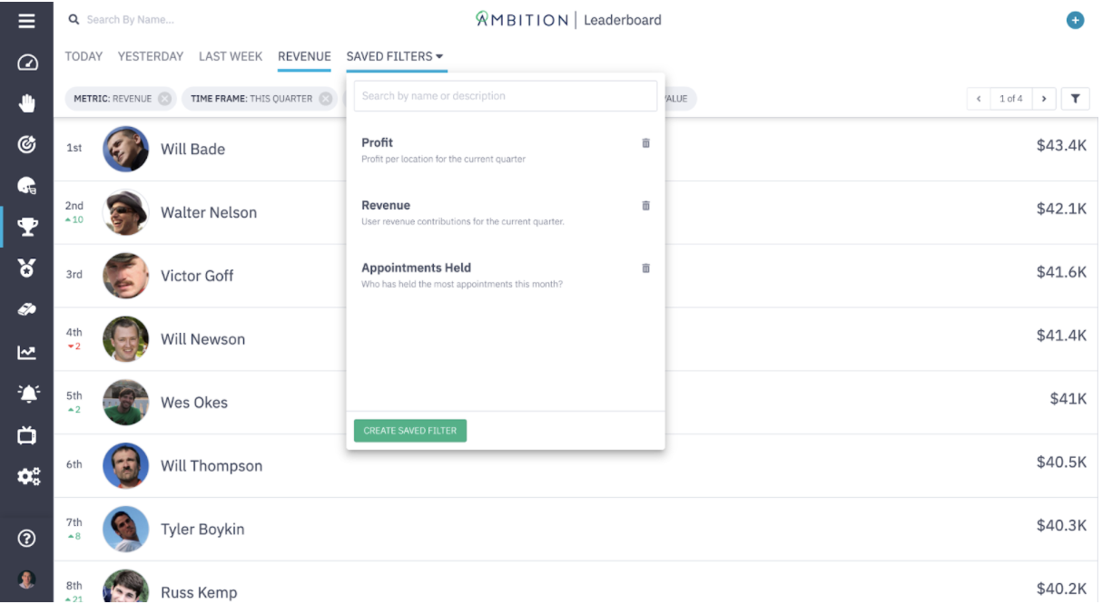 Sales leaders like you need efficiency wherever you can get it. Your days are packed managing hybrid teams, interfacing with top-tier prospects, and forecasting for executive leadership—and we know even the smallest Ambition enhancements can give you valuable time back. That’s why we’re excited to roll out Saved Filters within Leaderboards.