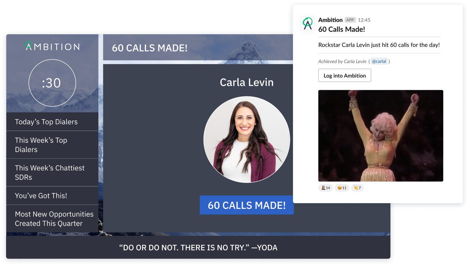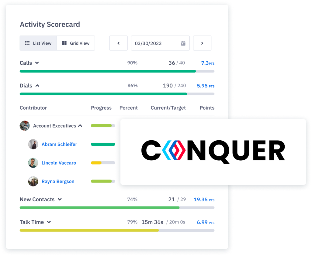 Automatically track key metrics from Conquer in an Ambition scorecard to keep your reps focused on the activities that drive results. Scorecard visualization will motivate them to complete and log sales activities, ultimately driving higher productivity and more frequent goal attainment. Set celebration alerts to fire when someone hits their activity score to recognize and promote good behavior across your organization.
